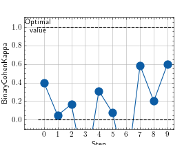 >>> from torch import rand, randint >>> # Example plotting multiple values >>> from torchmetrics.classification import BinaryCohenKappa >>> metric = BinaryCohenKappa() >>> values = [ ] >>> for _ in range(10): ... values.append(metric(rand(10), randint(2,(10,)))) >>> fig_, ax_ = metric.plot(values)