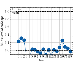 >>> from torch import randn, randint >>> # Example plotting a multiple values >>> from torchmetrics.classification import MulticlassCohenKappa >>> metric = MulticlassCohenKappa(num_classes=3) >>> values = [] >>> for _ in range(20): ... values.append(metric(randn(20,3).softmax(dim=-1), randint(3, (20,)))) >>> fig_, ax_ = metric.plot(values)