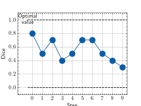 >>> # Example plotting multiple values >>> from torch import randint >>> from torchmetrics.classification import Dice >>> metric = Dice() >>> values = [ ] >>> for _ in range(10): ... values.append(metric(randint(2,(10,)), randint(2,(10,)))) >>> fig_, ax_ = metric.plot(values)