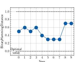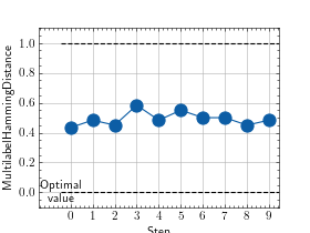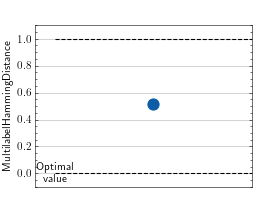 \[\text{Hamming distance} = \frac{1}{N \cdot L} \sum_i^N \sum_l^L 1(y_{il} \neq \hat{y}_{il})\]Where \(y\) is a tensor of target values, \(\hat{y}\) is a tensor of predictions, and \(\bullet_{il}\) refers to the \(l\)-th label of the \(i\)-th sample of that tensor.