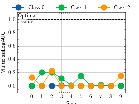 >>> # Example plotting multiple values >>> import torch >>> from torchmetrics.classification import MulticlassLogAUC >>> metric = MulticlassLogAUC(num_classes=3) >>> values = [ ] >>> for _ in range(10): ... values.append(metric(torch.randn(20, 3), torch.randint(3, (20,)))) >>> fig_, ax_ = metric.plot(values)