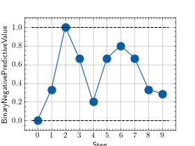 >>> from torch import rand, randint >>> # Example plotting multiple values >>> from torchmetrics.classification import BinaryNegativePredictiveValue >>> metric = BinaryNegativePredictiveValue() >>> values = [ ] >>> for _ in range(10): ... values.append(metric(rand(10), randint(2,(10,)))) >>> fig_, ax_ = metric.plot(values)