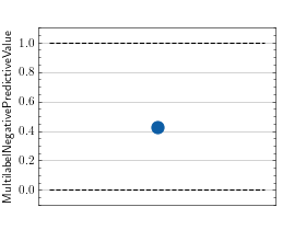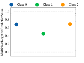 \[\text{Negative Predictive Value} = \frac{\text{TN}}{\text{TN} + \text{FP}}\]Where \(\text{TN}\) and \(\text{FP}\) represent the number of true negatives and false positives respectively. The metric is only proper defined when \(\text{TN} + \text{FP} \neq 0\). If this case is encountered for any label, the metric for that label will be set to 0 and the overall metric may therefore be affected in turn.