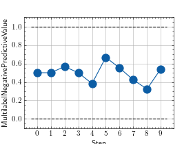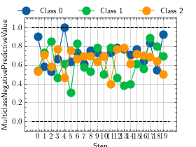 >>> from torch import rand, randint >>> # Example plotting multiple values >>> from torchmetrics.classification import MultilabelNegativePredictiveValue >>> metric = MultilabelNegativePredictiveValue(num_labels=3) >>> values = [ ] >>> for _ in range(10): ... values.append(metric(randint(2, (20, 3)), randint(2, (20, 3)))) >>> fig_, ax_ = metric.plot(values)
