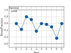 >>> from torch import rand, randint >>> # Example plotting multiple values >>> from torchmetrics.classification import BinaryPrecision >>> metric = BinaryPrecision() >>> values = [ ] >>> for _ in range(10): ... values.append(metric(rand(10), randint(2,(10,)))) >>> fig_, ax_ = metric.plot(values)