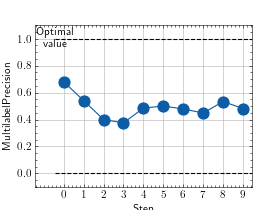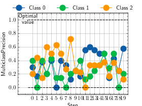 >>> from torch import rand, randint >>> # Example plotting multiple values >>> from torchmetrics.classification import MultilabelPrecision >>> metric = MultilabelPrecision(num_labels=3) >>> values = [ ] >>> for _ in range(10): ... values.append(metric(randint(2, (20, 3)), randint(2, (20, 3)))) >>> fig_, ax_ = metric.plot(values)