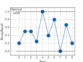 >>> from torch import rand, randint >>> # Example plotting multiple values >>> from torchmetrics.classification import BinaryRecall >>> metric = BinaryRecall() >>> values = [ ] >>> for _ in range(10): ... values.append(metric(rand(10), randint(2,(10,)))) >>> fig_, ax_ = metric.plot(values)