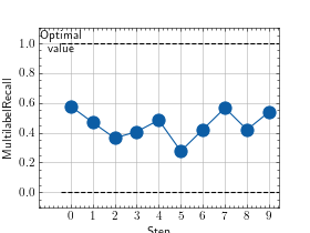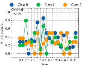 >>> from torch import rand, randint >>> # Example plotting multiple values >>> from torchmetrics.classification import MultilabelRecall >>> metric = MultilabelRecall(num_labels=3) >>> values = [ ] >>> for _ in range(10): ... values.append(metric(randint(2, (20, 3)), randint(2, (20, 3)))) >>> fig_, ax_ = metric.plot(values)