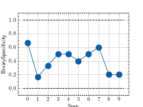 >>> from torch import rand, randint >>> # Example plotting multiple values >>> from torchmetrics.classification import BinarySpecificity >>> metric = BinarySpecificity() >>> values = [ ] >>> for _ in range(10): ... values.append(metric(rand(10), randint(2,(10,)))) >>> fig_, ax_ = metric.plot(values)
