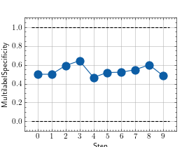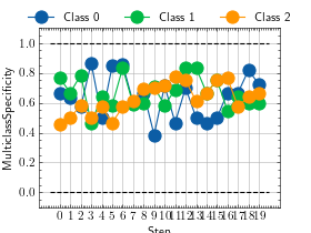 >>> from torch import rand, randint >>> # Example plotting multiple values >>> from torchmetrics.classification import MultilabelSpecificity >>> metric = MultilabelSpecificity(num_labels=3) >>> values = [ ] >>> for _ in range(10): ... values.append(metric(randint(2, (20, 3)), randint(2, (20, 3)))) >>> fig_, ax_ = metric.plot(values)