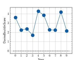 >>> # Example plotting multiple values >>> import torch >>> from torchmetrics.clustering import DaviesBouldinScore >>> metric = DaviesBouldinScore() >>> values = [ ] >>> for _ in range(10): ... values.append(metric(torch.randn(10, 3), torch.randint(0, 2, (10,)))) >>> fig_, ax_ = metric.plot(values)