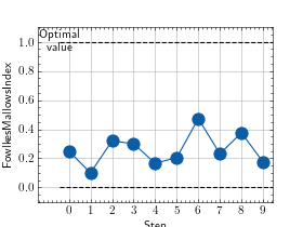 >>> # Example plotting multiple values >>> import torch >>> from torchmetrics.clustering import FowlkesMallowsIndex >>> metric = FowlkesMallowsIndex() >>> values = [ ] >>> for _ in range(10): ... values.append(metric(torch.randint(0, 4, (10,)), torch.randint(0, 4, (10,)))) >>> fig_, ax_ = metric.plot(values)