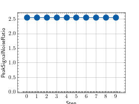 >>> # Example plotting multiple values >>> import torch >>> from torchmetrics.image import PeakSignalNoiseRatio >>> metric = PeakSignalNoiseRatio() >>> preds = torch.tensor([[0.0, 1.0], [2.0, 3.0]]) >>> target = torch.tensor([[3.0, 2.0], [1.0, 0.0]]) >>> values = [ ] >>> for _ in range(10): ... values.append(metric(preds, target)) >>> fig_, ax_ = metric.plot(values)