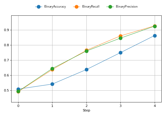 Do note that metrics that do not return simple scalar tensors, such as ConfusionMatrix, ROC that have specialized visualization does not support plotting multiple steps, out of the box and the user needs to manually plot the values for each step.