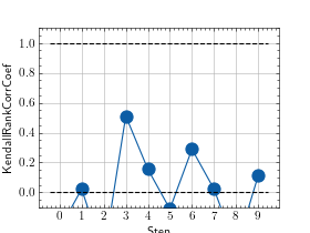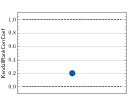 >>> from torch import randn >>> # Example plotting multiple values >>> from torchmetrics.regression import KendallRankCorrCoef >>> metric = KendallRankCorrCoef() >>> values = [] >>> for _ in range(10): ... values.append(metric(randn(10,), randn(10,))) >>> fig, ax = metric.plot(values)