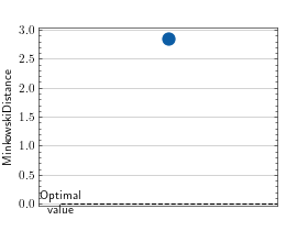 \[\begin{split}d_{\text{Minkowski}} = \\sum_{i}^N (| y_i - \\hat{y_i} |^p)^\frac{1}{p}\end{split}\]This metric can be seen as generalized version of the standard euclidean distance which corresponds to minkowski distance with p=2.