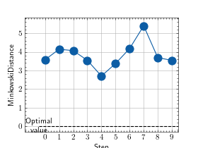 >>> from torch import randn >>> # Example plotting multiple values >>> from torchmetrics.regression import MinkowskiDistance >>> metric = MinkowskiDistance(p=3) >>> values = [] >>> for _ in range(10): ... values.append(metric(randn(10,), randn(10,))) >>> fig, ax = metric.plot(values)