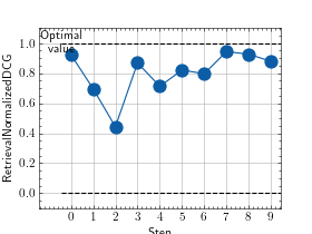 >>> import torch >>> from torchmetrics.retrieval import RetrievalNormalizedDCG >>> # Example plotting multiple values >>> metric = RetrievalNormalizedDCG() >>> values = [] >>> for _ in range(10): ... values.append(metric(torch.rand(10,), torch.randint(2, (10,)), indexes=torch.randint(2,(10,)))) >>> fig, ax = metric.plot(values)