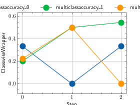 >>> # Example plotting multiple values >>> import torch >>> from torchmetrics.wrappers import ClasswiseWrapper >>> from torchmetrics.classification import MulticlassAccuracy >>> metric = ClasswiseWrapper(MulticlassAccuracy(num_classes=3, average=None)) >>> values = [ ] >>> for _ in range(3): ... values.append(metric(torch.randint(3, (20,)), torch.randint(3, (20,)))) >>> fig_, ax_ = metric.plot(values)